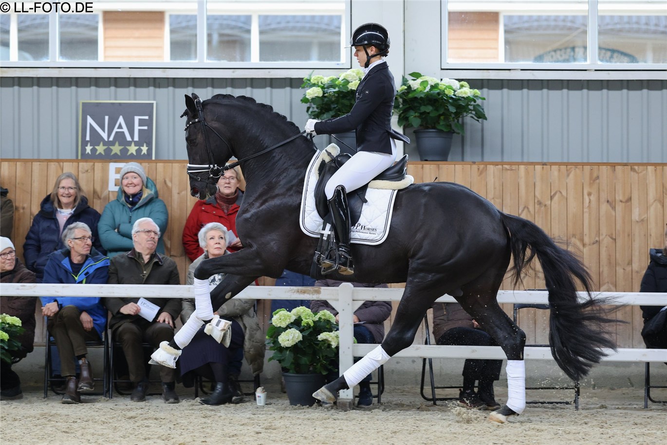 Vi viste en række ungheste frem trukket på vores elitehoppe A la Fasine (Apache x Furst Romancier x Sir Donnerhall), som er trukket på samme hoppestamme - nemlig Gesine stammen. Her var det særligt den 2 årige hingst HP La Fontaine (Las Vegas x Apache x Fürst Romancier) som tiltrak sig stor opmærksomhed.